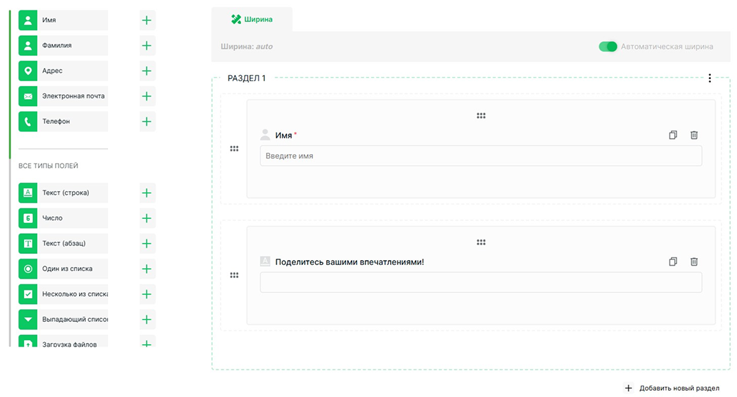 - Simple and fast setup. Creating a form is done through an intuitive interface. All the necessary elements are already available in the builder: text input fields, dropdown lists, radio buttons, checkboxes, file upload fields, date/time pickers, buttons, and more. Simply drag the required fields into the form, specify their names and properties — all in just a few minutes.