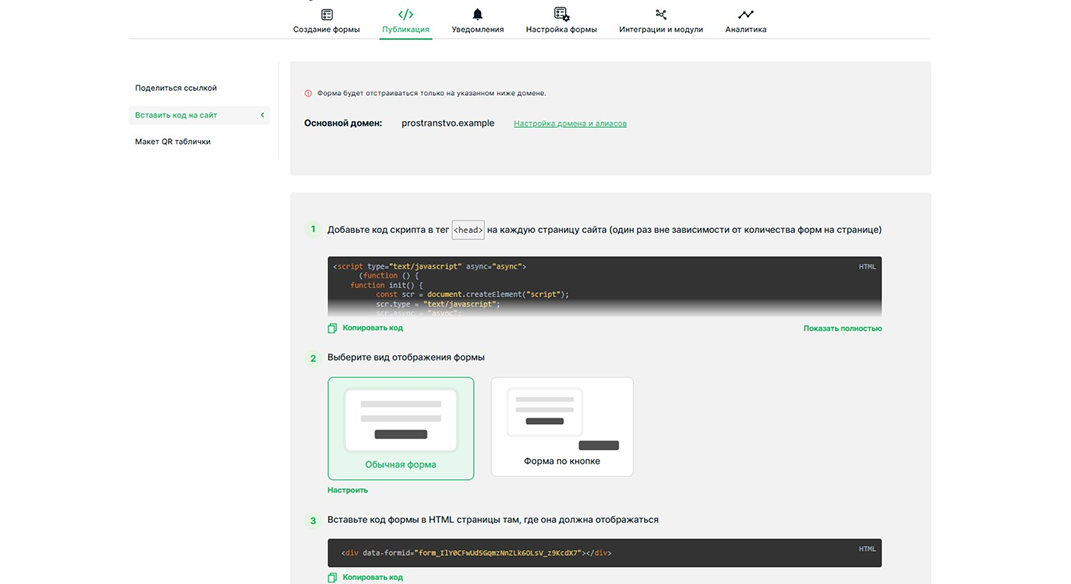 - Publishing the form on the website. Once the form is configured and tested, save the changes. Next, you need to embed the form on your website. QForm automatically generates a widget code – usually a few lines of JavaScript. Locate the “Get Code” button or the “Publication” section in the interface. Copy the provided embed code. Now open your site’s admin panel (CMS) or the source HTML of the desired page and paste this code where you want the form to appear. Typically, the code is inserted before the closing <body> tag or into a dedicated scripts/widgets block if your CMS supports it. For example, in WordPress, you can use an HTML block in the page builder or install the QForm plugin (if available). If you are unsure where to place the code, refer to QForm documentation – it contains installation guides for popular platforms (Tilda, WordPress, etc.). After embedding the code, save the changes on your website.
