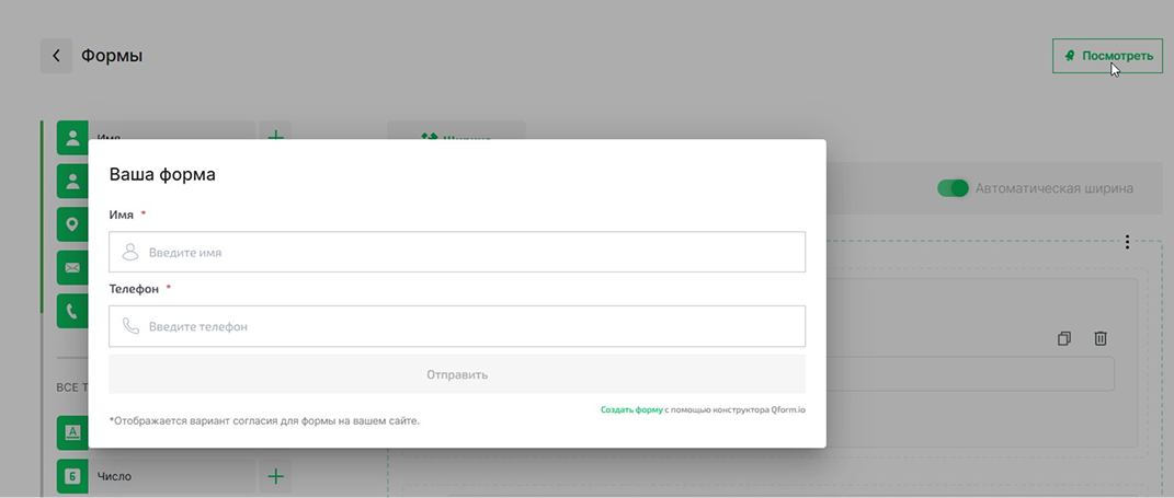 - Preview and testing. During setup, you can check at any time how the form looks and works. QForm provides a preview mode: click the special button (shaped like a rocket or an eye) in the builder, and the form will open in draft mode. Check that all fields are displayed correctly, the text is clear, and there are no unnecessary elements. Try filling out the form with test data and submit it – ensure that the success message appears and that a new entry is created in your CRM. At this stage, you can return to the builder to make adjustments (e.g., change the field order, add hints, or tweak the design), and then test again. Repeat until the result fully satisfies you.