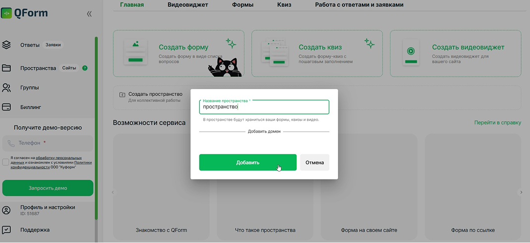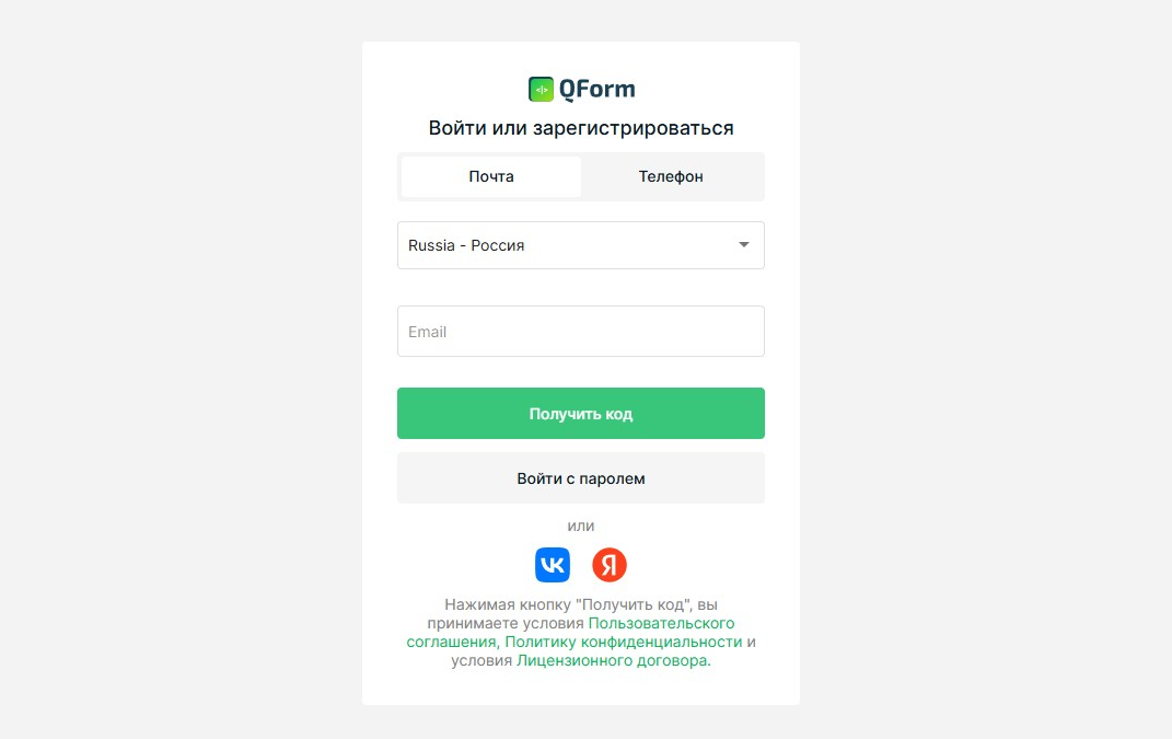 - Registration in QForm. Go to the official QForm website and create an account (registration is free). After registering, you will be redirected to your QForm dashboard.