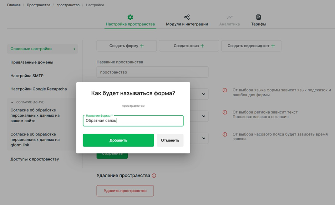- Creating a form. After adding a space, click the “Create Form” button and give it a name (e.g., “Feedback” or “Contact Us”). Then, the form builder page will open, where you can configure the fields of your new form.