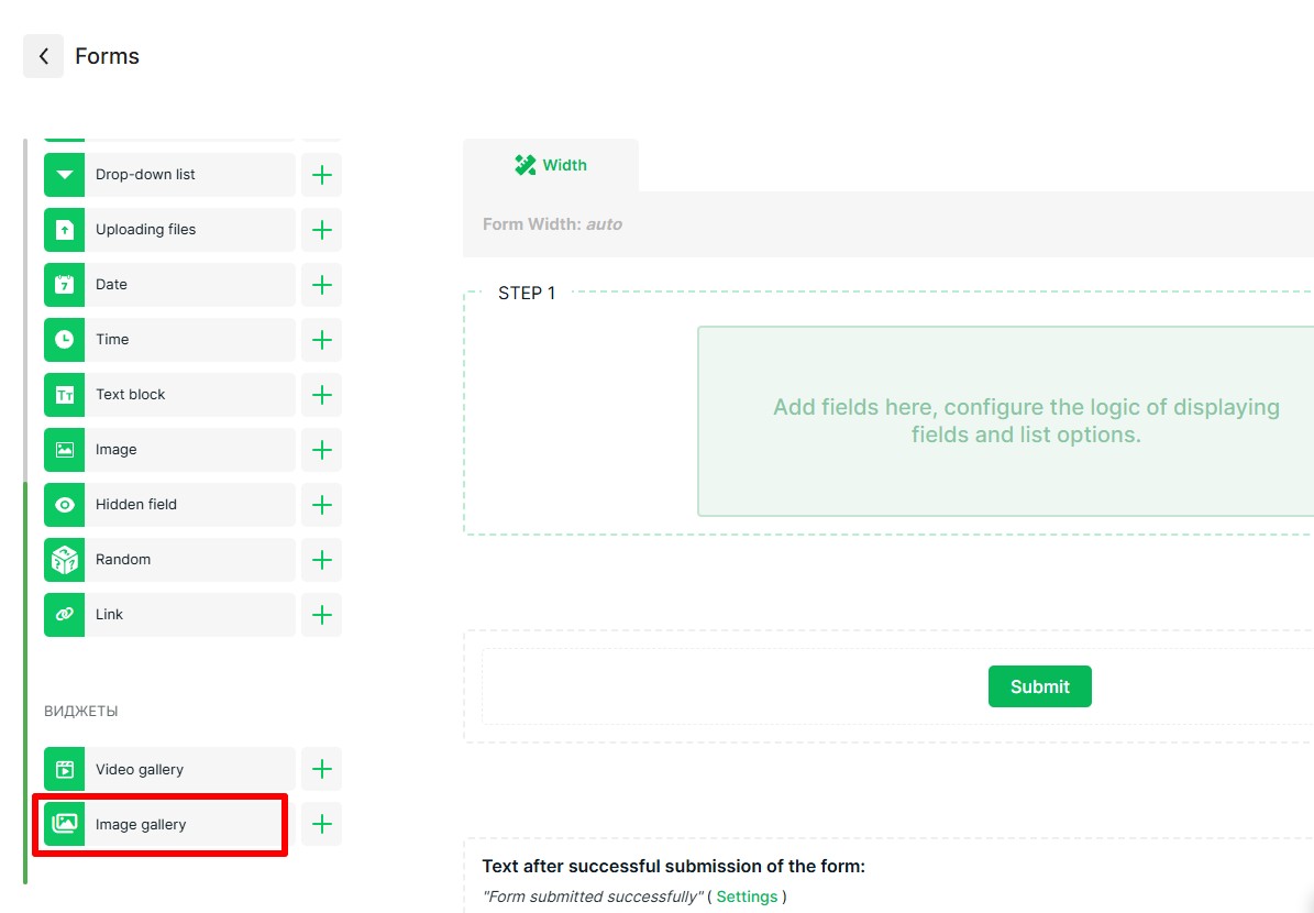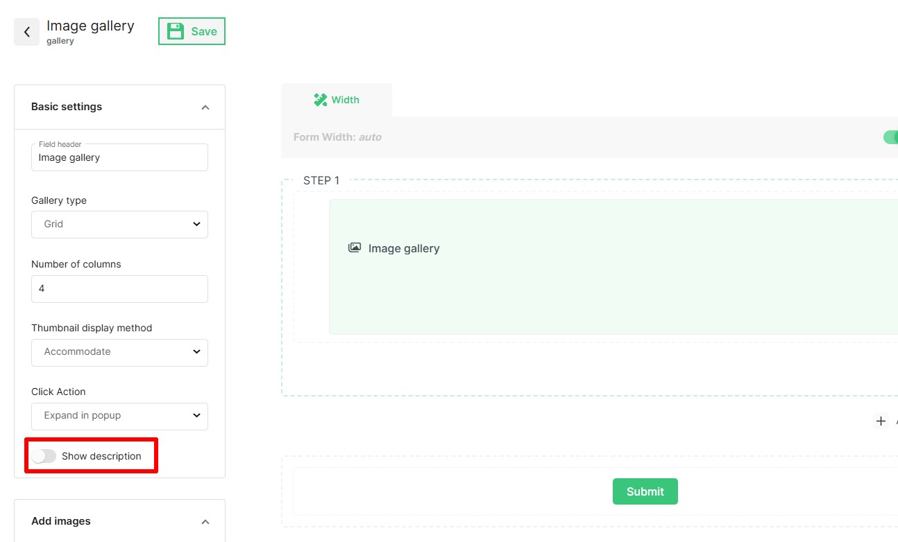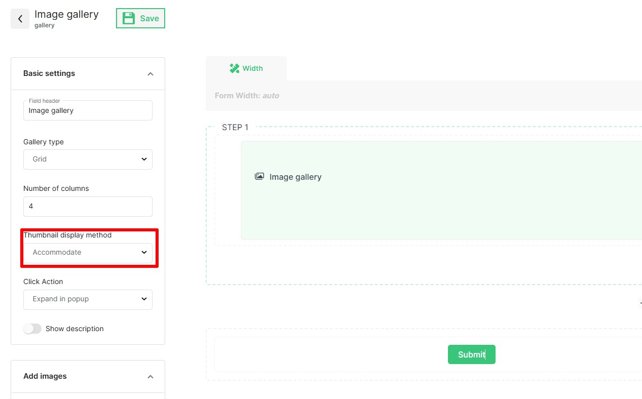Click create form and add the Photo Gallery field in the builder.