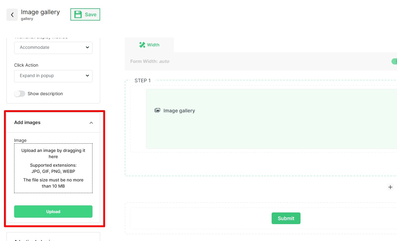 Then select the action that will occur when the image is clicked: "Expand to popup" or "Do nothing".