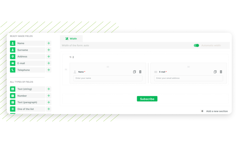Create newsletter subscription forms and collect visitors' emails in mailing lists or CRM QForm. Set up the form in a convenient constructor and paste it on any website in a few simple steps