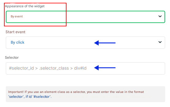 In the widget appearance field, select the "By event" option, and then define the launch event: with a time delay, on click, on hover, or on scroll to the block.
